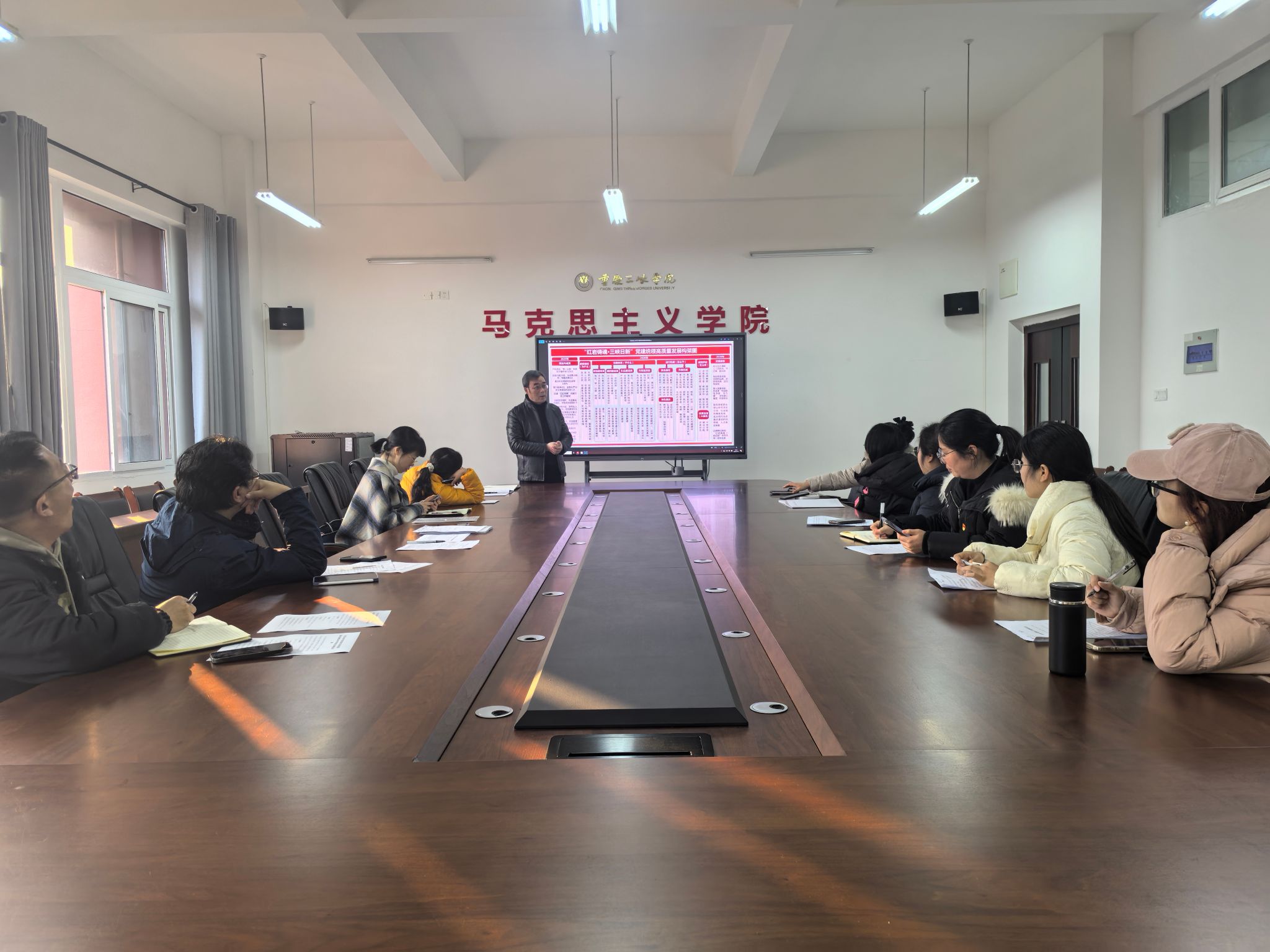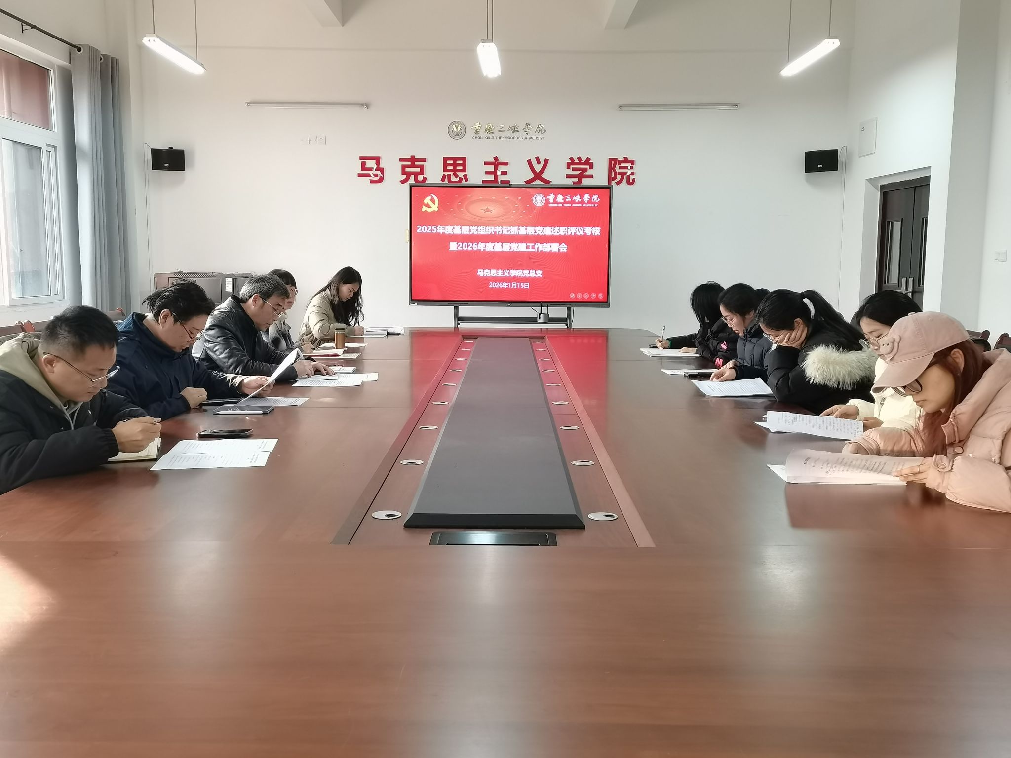 为深入贯彻落实新时代党的建设总要求,持续提升基层党建工作规范化、科学化水平,推动全面从严治党向基层延伸,1月15日下午,马克思主义学院党总支在博学楼3-426会议室召开2025年度基层党组织书记抓党建述职评议考核会,并同步部署2026年度基层党建工作。会议由学院党总支书记任鹏主持,学院党政领导班子成员、专职组织员、总支委员、各师生党支部书记及支部委员参加会议。